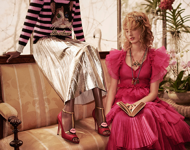 If it’s Gucci it has to be exotic. The iconic brand’s new advertising campaign for pre-fall 2016 takes a leaf from the tropical with beautiful white long-necked flamingos hanging around with a group of models wearing metallic silver skirt, shimmering gold gloves and shoes, dresses that have flirty and flouncy sleeves in girly pink with high heels decorated with pink lips and jackets with floral motif.