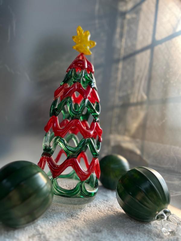 The creation of a solid glass Christmas tree employs the cage technique, where strips of glass are skillfully pulled to form a delicate cage. The artist intricately sculpts the tree shape by weaving and manipulating the glass, showcasing expertise in shaping while maintaining structural integrity. The final result is a sophisticated and festive glass Christmas tree that captures the holiday spirit with grace and beauty.
