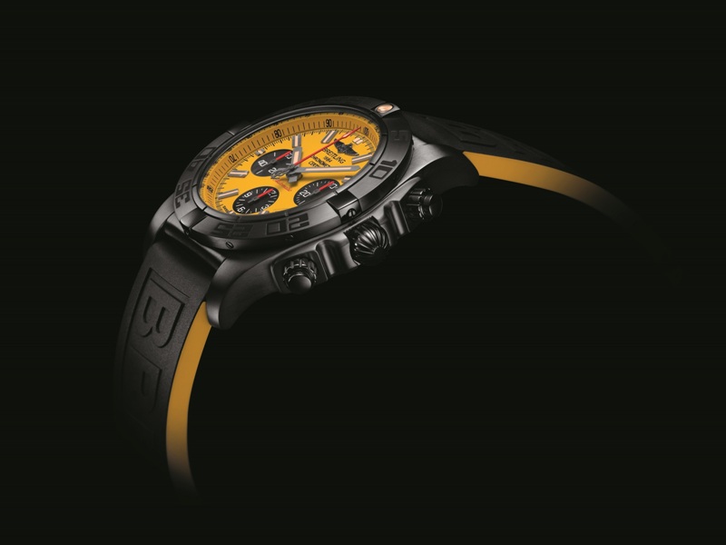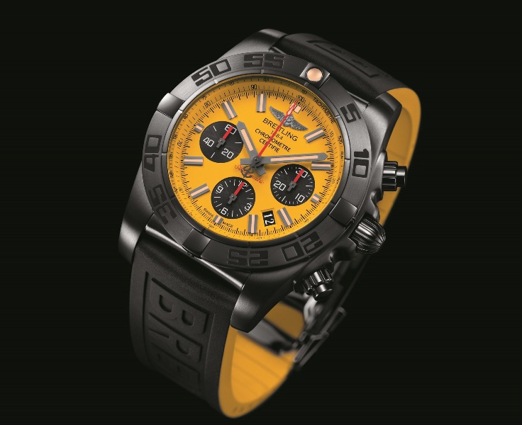 Strong bold and so very masculine, we are crushing over this beautiful Brietling Chronomat 44 Blacksteel special edition with a yellow dial that seem to say "wear me" with total abandon. The watch emanates sturdiness and high performance and sheer masculinity. The satin-brushed steel case and bezel stand out by their black carbon-based high-resistance treatment. They make a powerful contrast with the yellow dial – Breitling’s signature color – against which the black counters and red hands reminiscent of instrument panels stand out with admirable clarity.