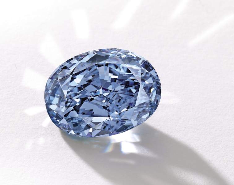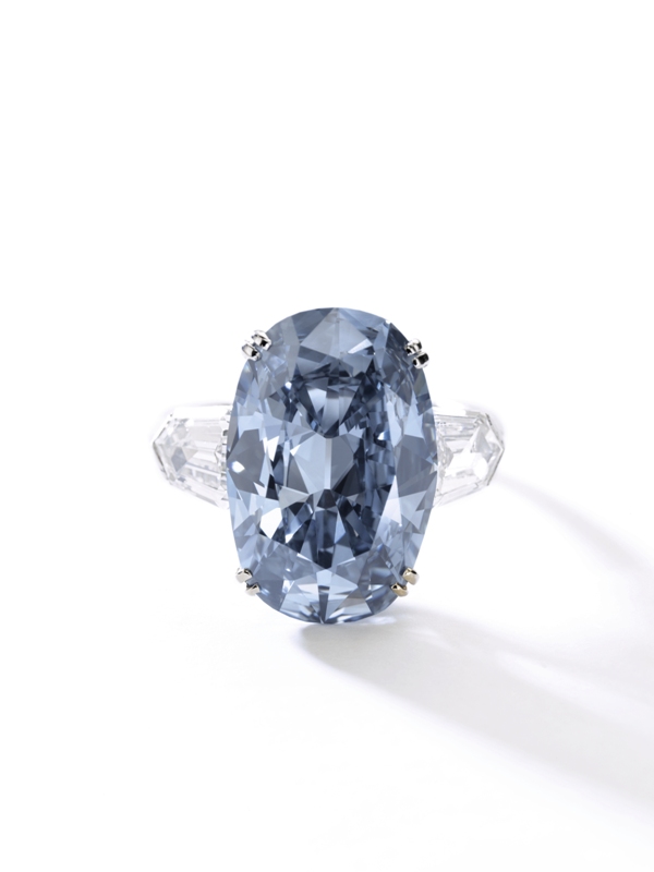 A superb oval, internally flawless, fancy vivid blue diamond weighing 10.10 carats. Set with an oval brilliant-cut diamond, flanked by two pear-shaped diamonds, to the circular-cut diamond surround, gallery and hoop. The sale achieved the highest price ever paid for a jewel at auction in Asia.